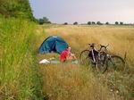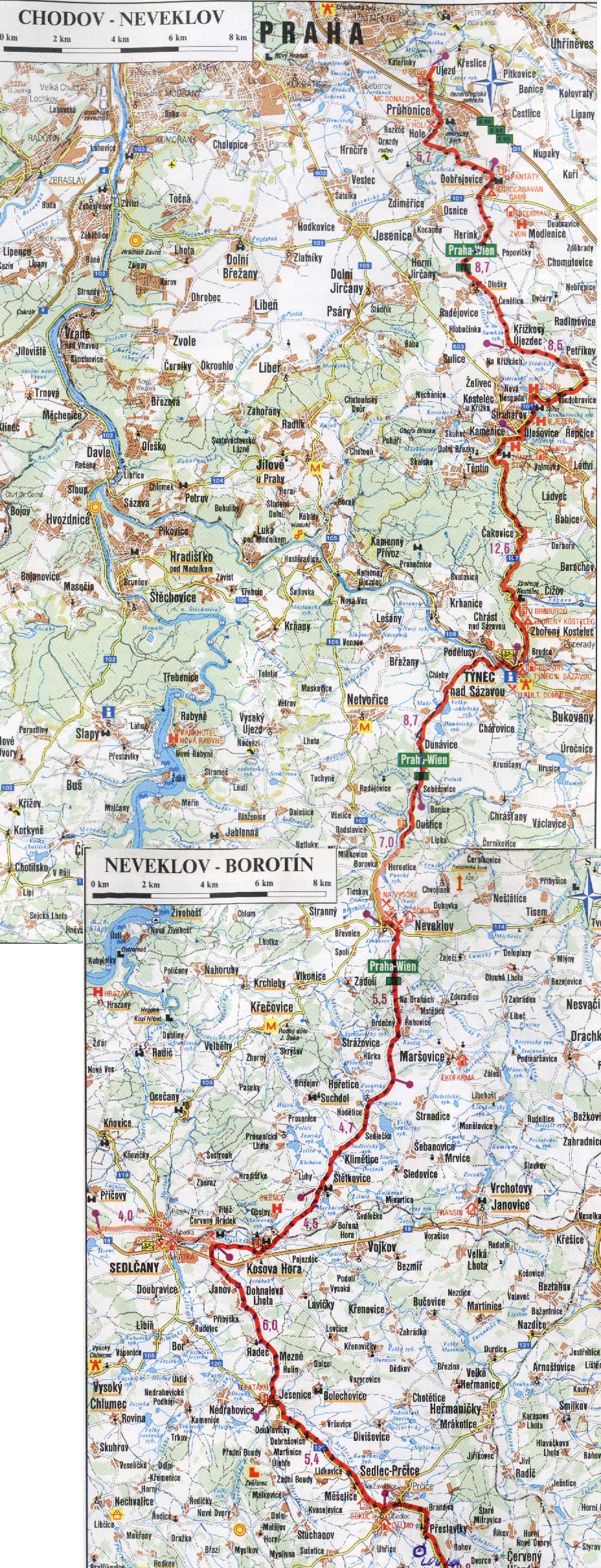 Z krásného snu nás probudil v 7:00 h. budík, který jsme hbitě zamáčkli a spali dál, ale po chvíli nám to došlo, vždyť dnes odjíždíme do Vídně. Rychle jsme vyskočili, nasnídali, natáhli na sebe profesionální oblečení na kolo, no přeci nejsme žádný žabaři, jedem už do Vídně. A kolem osmé hodiny (skoro až v devět) jsme vyrazili směr Hostivař ještě za doprovodu táty, no přeci musíme mít sebou bodygarda, co kdyby se nám něco stalo hned na začátku cesty. Plní elánu a s úsměvem jsme se vydali na cestu. Bohužel ani jsme nevyjeli z Prahy a už jsme zjistili, že jsme se ztratili, ještě že jsme měli sebou tu mapu Prahy, ale stejně nám to moc nepomohlo a tak jsme vyrazili podle slunička, směr jsme měli dobrý,ale cesta byla špatná. Jeli jsme po červené turistické, takže pro naše kola, to byla výzva si užít trochu kořenů a skoček. Ale brašny to trochu bojkotovali, takže když jsme se dostali do Průhonic byli jsme pěkně vydrkotaný a o zadku ani nemluvím a to nás ještě čekal kus cesty. Napili jsme se, nabrali síly, zamávali taťkovi a vyrazili směr Týnec nad Sázavou, to bylo kopečků, ale zas z kopečků a tak jsme dojeli až do Neveklova. Další zastávkou měla být Kosova Hora, kde byl náš cíl hospůdka s oroseným pivkem, tak nás ta představa hnala kupředu, že jsme najednou seděli u pivka a ještě měli před sebou utopence, tak přeci správný sportovec musí někde nabrat energii, ne. Vůbec se nám nechtělo od pivka, ale čas utíkal a my stále nevěděli, kde dnes budeme spát. Kemp na mapě v blízkosti žádný a tak jsme si řekli, že dojedeme do města Sedlec-Prčice a tam někde ve volné přírodě se zabydlíme mezi zvířátky. A tak se i stalo, dojeli jsme tam, bylo zrovna posvícení, takže lidí moc, muzika hrála a my uřícení. Hned jsme byli středem pozornosti. Rychle jsme ujížděli až jsme dojeli na malou loučku, kde jsme se hned usadili a vybalili jídlo. Pěkně nacpaný instantní polévkou jsme vyrazili se umýt do potůčku, který tekl nedaleko, to bylo osvěžující, ta ledová voda a čistá, tedy než jsme tam vlezli my. Osvěženi jsme si zalezli do spacáků a poslouchali v dáli muziku, která byla slyšet z města.