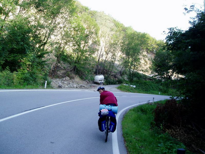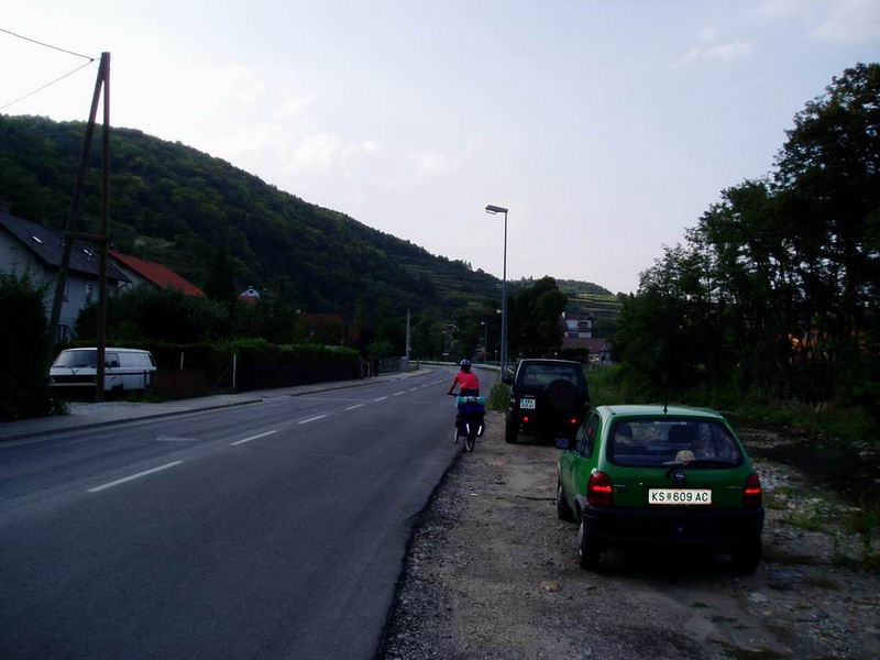 Ráno nás probudili kostelní zvony, že by opět svátek?!! Rozjeli jsme se k obchodu pro snídu a na štěstí bylo otevřeno, tak jsme si nakoupili jídlo na ráno i oběd. Pak jsme zašli koupit mapy, koupili jsme průvodce podél Dunaje a pak cyklomapu Rakouska oblast Niederösterreich-Wien. Už nám chyběl jen tachometr,ten jsme koupili až při cestě. Při snídani jsme se rozhodli jak pojedeme. Vezmeme to podél Dunaje až ke Kremsu a tam to vezmeme na sever k hranicím. Kolem Dunaje se jelo krásně, rovinka a koupání hned po pravé ruce, vždy jsme jen zastavili a skočili do vody. Do Kremsu to bylo asi 70 km a přijeli jsme tam v podvečer a tak jsme zašli na jednu pivní limonádu a rozhodli se, že tu nezůstaneme v kempu, ale že jsme ještě plni sil pokračovat v cestě. Vydali jsme se dál kolem řeky Krems, obklopovali nás hory, které jsme později museli zdolat. Asi tak po 20 km jsme uviděli krásné místo v lese u potůčku a tak jsme k němu hned zamířili a zabydleli se. Když už jsme skoro usínali, zaslechli jsme takové podivné zvuky, vypadalo to jako by někdo chodil blízko stanu. Tak nás to vyděsilo, že jsme to museli jít ven zkouknout, nikdo, nikde, až pak se ten zvuk ozval opět blízko našich kol a koho jsme to neviděli malinká žabička, která byla víc vyděšená než my. Oddechli jsme si a v klidu usnuli.